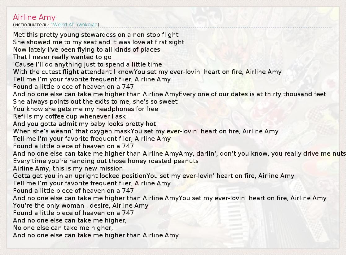 And no one else can take me higher than Airline AmyYou set my ever-lovin' heart on fire, Airline Amy