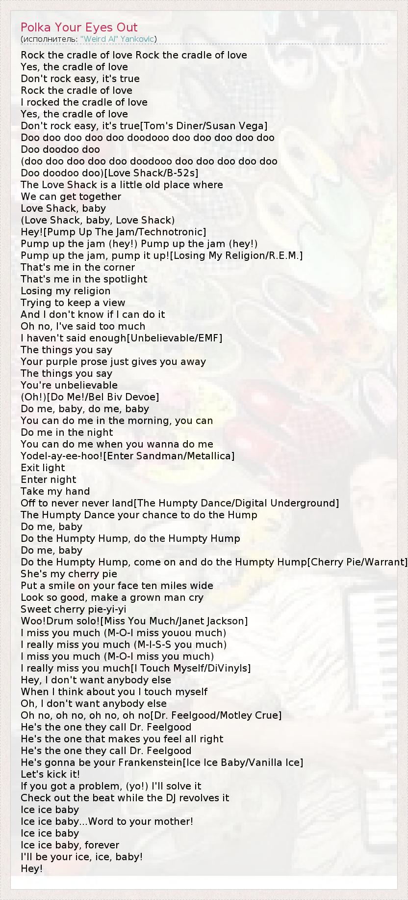 Rock the cradle of love Rock the cradle of love Yes, the cradle of love Don't rock easy, it's true Rock the cradle of love I rocked the cradle of love Yes, the cradle of love Don't rock easy, it's true[Tom's Diner/Susan Vega] Doo doo doo doo doo doodooo doo doo doo doo doo Doo doodoo doo (doo doo doo doo doo doodooo doo doo doo doo doo Doo doodoo doo)[Love Shack/B-52s] The Love Shack is a little old place where We can get together Love Shack, baby (Love Shack, baby, Love Shack) Hey![Pump Up The Jam/Technotronic] Pump up the jam (hey!) Pump up the jam (hey!) Pump up the jam, pump it up![Losing My Religion/R.E.M.] That's me in the corner That's me in the spotlight Losing my religion Trying to keep a view And I don't know if I can do it Oh no, I've said too much I haven't said enough[Unbelievable/EMF] The things you say Your purple prose just gives you away The things you say You're unbelievable (Oh!)[Do Me!/Bel Biv Devoe] Do me, baby, do me, baby You can do me in the morning, you can Do me in the night You can do me when you wanna do me Yodel-ay-ee-hoo![Enter Sandman/Metallica] Exit light Enter night Take my hand Off to never never land[The Humpty Dance/Digital Underground] The Humpty Dance your chance to do the Hump Do me, baby Do the Humpty Hump, do the Humpty Hump Do me, baby Do the Humpty Hump, come on and do the Humpty Hump[Cherry Pie/Warrant] She's my cherry pie Put a smile on your face ten miles wide Look so good, make a grown man cry Sweet cherry pie-yi-yi Woo!Drum solo![Miss You Much/Janet Jackson] I miss you much (M-O-I miss youou much) I really miss you much (M-I-S-S you much) I miss you much (M-O-I miss you much) I really miss you much[I Touch Myself/DiVinyls] Hey, I don't want anybody else When I think about you I touch myself Oh, I don't want anybody else Oh no, oh no, oh no, oh no[Dr. Feelgood/Motley Crue] He's the one they call Dr. Feelgood He's the one that makes you feel all right He's the one they call Dr. Feelgood He's gonna be your Frankenstein[Ice Ice Baby/Vanilla Ice] Let's kick it! If you got a problem, (yo!) I'll solve it Check out the beat while the DJ revolves it Ice ice baby Ice ice baby...Word to your mother! Ice ice baby Ice ice baby, forever I'll be your ice, ice, baby! Hey!