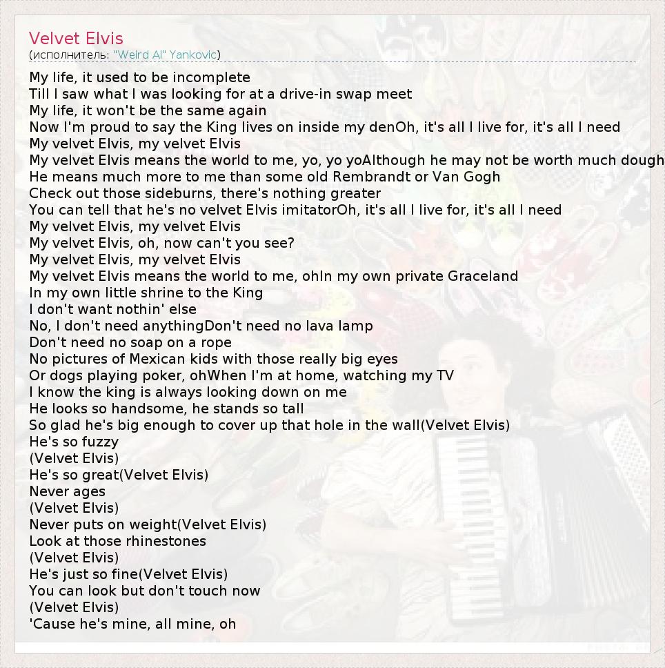 You can tell that he's no velvet Elvis imitatorOh, it's all I live for, it's all I need