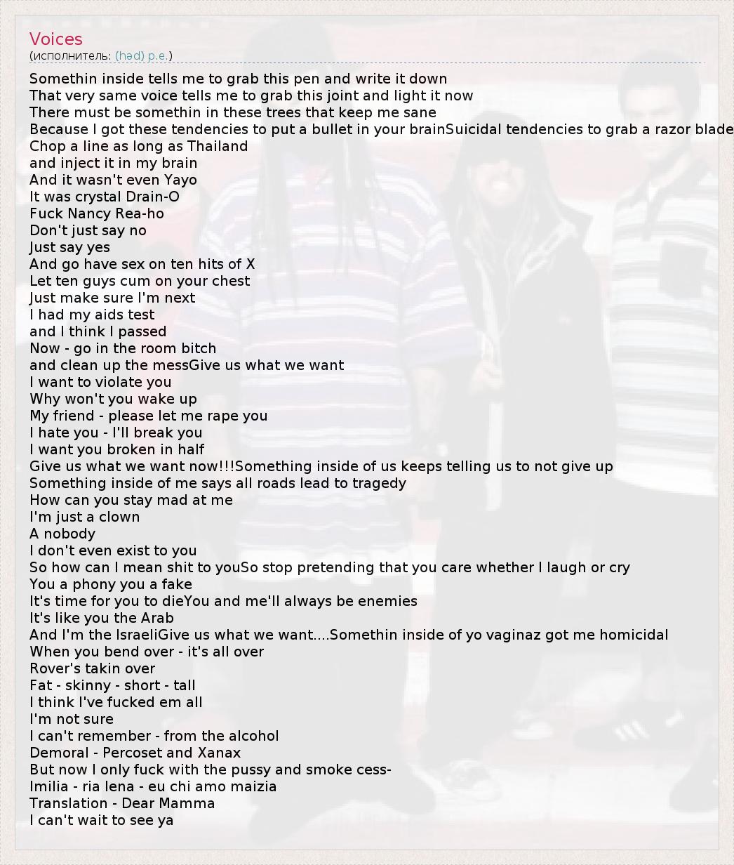 Somethin inside tells me to grab this pen and write it down That very same voice tells me to grab this joint and light it now There must be somethin in these trees that keep me sane Because I got these tendencies to put a bullet in your brainSuicidal tendencies to grab a razor blade Chop a line as long as Thailand and inject it in my brain And it wasn't even Yayo It was crystal Drain-O Fuck Nancy Rea-ho Don't just say no Just say yes And go have sex on ten hits of X Let ten guys cum on your chest Just make sure I'm next I had my aids test and I think I passed Now - go in the room bitch and clean up the messGive us what we want I want to violate you Why won't you wake up My friend - please let me rape you I hate you - I'll break you I want you broken in half Give us what we want now!!!Something inside of us keeps telling us to not give up Something inside of me says all roads lead to tragedy How can you stay mad at me I'm just a clown A nobody I don't even exist to you So how can I mean shit to youSo stop pretending that you care whether I laugh or cry You a phony you a fake It's time for you to dieYou and me'll always be enemies It's like you the Arab And I'm the IsraeliGive us what we want....Somethin inside of yo vaginaz got me homicidal When you bend over - it's all over Rover's takin over Fat - skinny - short - tall I think I've fucked em all I'm not sure I can't remember - from the alcohol Demoral - Percoset and Xanax But now I only fuck with the pussy and smoke cess- Imilia - ria lena - eu chi amo maizia Translation - Dear Mamma I can't wait to see ya