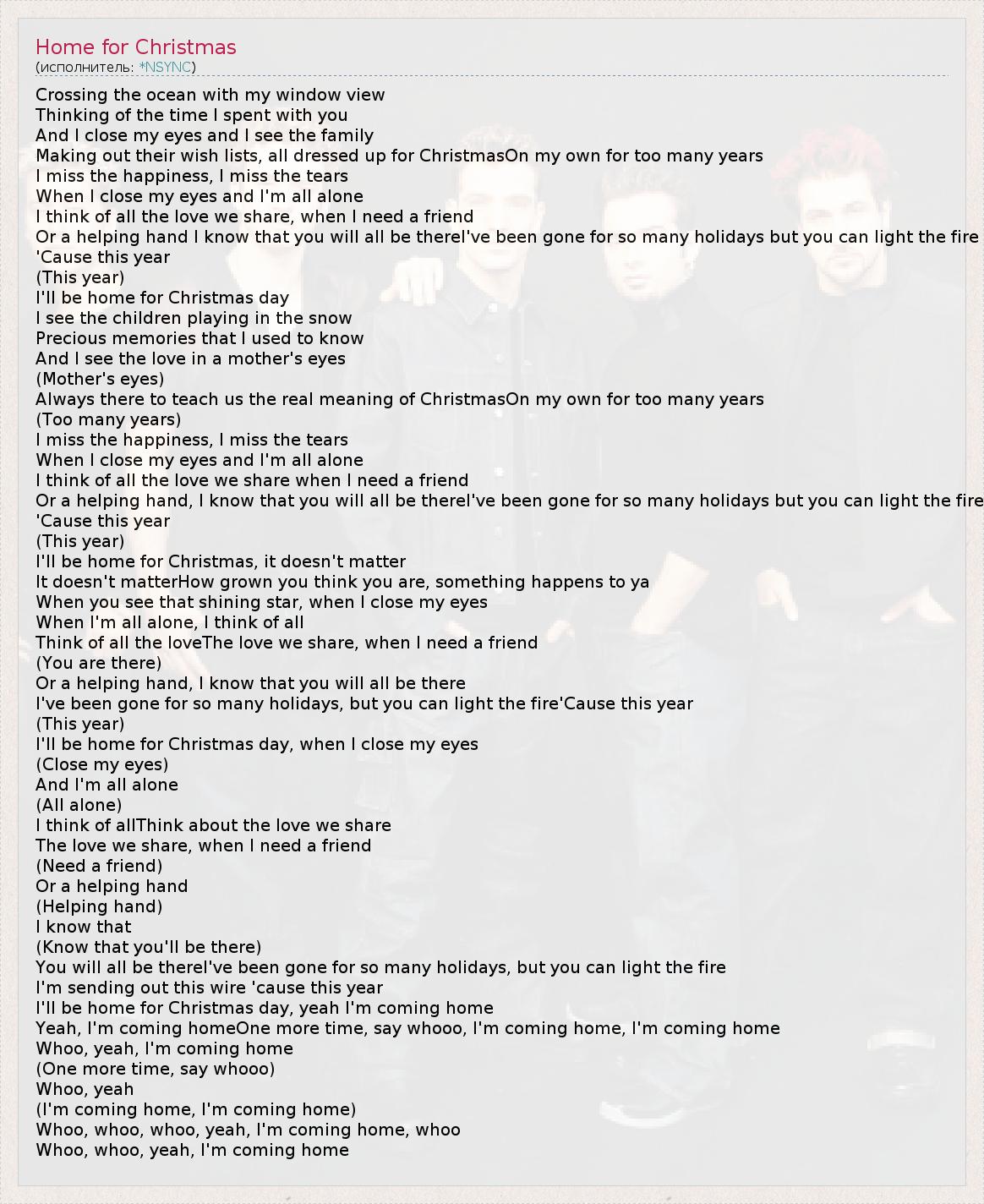 Crossing the ocean with my window view Thinking of the time I spent with you And I close my eyes and I see the family Making out their wish lists, all dressed up for ChristmasOn my own for too many years I miss the happiness, I miss the tears When I close my eyes and I'm all alone I think of all the love we share, when I need a friend Or a helping hand I know that you will all be thereI've been gone for so many holidays but you can light the fire 'Cause this year (This year) I'll be home for Christmas day I see the children playing in the snow Precious memories that I used to know And I see the love in a mother's eyes (Mother's eyes) Always there to teach us the real meaning of ChristmasOn my own for too many years (Too many years) I miss the happiness, I miss the tears When I close my eyes and I'm all alone I think of all the love we share when I need a friend Or a helping hand, I know that you will all be thereI've been gone for so many holidays but you can light the fire 'Cause this year (This year) I'll be home for Christmas, it doesn't matter It doesn't matterHow grown you think you are, something happens to ya When you see that shining star, when I close my eyes When I'm all alone, I think of all Think of all the loveThe love we share, when I need a friend (You are there) Or a helping hand, I know that you will all be there I've been gone for so many holidays, but you can light the fire'Cause this year (This year) I'll be home for Christmas day, when I close my eyes (Close my eyes) And I'm all alone (All alone) I think of allThink about the love we share The love we share, when I need a friend (Need a friend) Or a helping hand (Helping hand) I know that (Know that you'll be there) You will all be thereI've been gone for so many holidays, but you can light the fire I'm sending out this wire 'cause this year I'll be home for Christmas day, yeah I'm coming home Yeah, I'm coming homeOne more time, say whooo, I'm coming home, I'm coming home Whoo, yeah, I'm coming home (One more time, say whooo) Whoo, yeah (I'm coming home, I'm coming home) Whoo, whoo, whoo, yeah, I'm coming home, whoo Whoo, whoo, yeah, I'm coming home