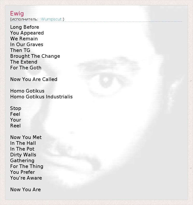 Задолго до Вы Появился Мы по-прежнему В наших Могилы Затем Т. Привлечены изменение Расширить Для Гот Теперь вы призваны Homo Gotikus Homo Gotikus Industrialis Стоп Чувствовать Ваш катушка Теперь Вы Met В зале В кастрюлю Грязные стены сбор За вещь Вы предпочитаете Вы знаете Теперь Вы