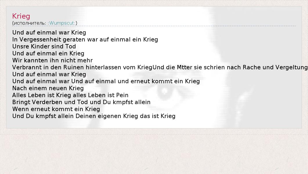 Und auf einmal war Krieg In Vergessenheit geraten war auf einmal ein Krieg Unsre Kinder sind Tod Und auf einmal ein Krieg Wir kannten ihn nicht mehr Verbrannt in den Ruinen hinterlassen vom KriegUnd die Mtter sie schrien nach Rache und Vergeltung Und auf einmal war Krieg Und auf einmal war Und auf einmal und erneut kommt ein Krieg Nach einem neuen Krieg Alles Leben ist Krieg alles Leben ist Pein Bringt Verderben und Tod und Du kmpfst allein Wenn erneut kommt ein Krieg Und Du kmpfst allein Deinen eigenen Krieg das ist Krieg