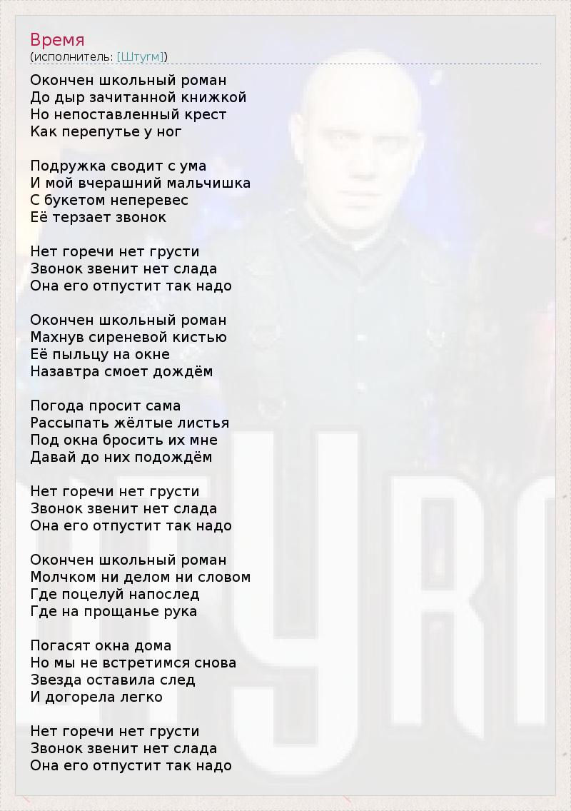 Окончен школьный роман До дыр зачитанной книжкой Но непоставленный крест Как перепутье у ног Подружка сводит с ума И мой вчерашний мальчишка С букетом неперевес Её терзает звонок Нет горечи нет грусти Звонок звенит нет слада Она его отпустит так надо Окончен школьный роман Махнув сиреневой кистью Её пыльцу на окне Назавтра смоет дождём Погода просит сама Рассыпать жёлтые листья Под окна бросить их мне Давай до них подождём Нет горечи нет грусти Звонок звенит нет слада Она его отпустит так надо Окончен школьный роман Молчком ни делом ни словом Где поцелуй напослед Где на прощанье рука Погасят окна дома Но мы не встретимся снова Звезда оставила след И догорела легко Нет горечи нет грусти Звонок звенит нет слада Она его отпустит так надо