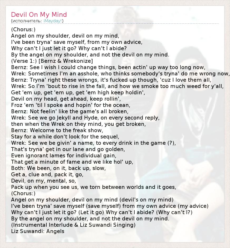 А как ты думаешь, о чем песня "Devil On My Mind" ?