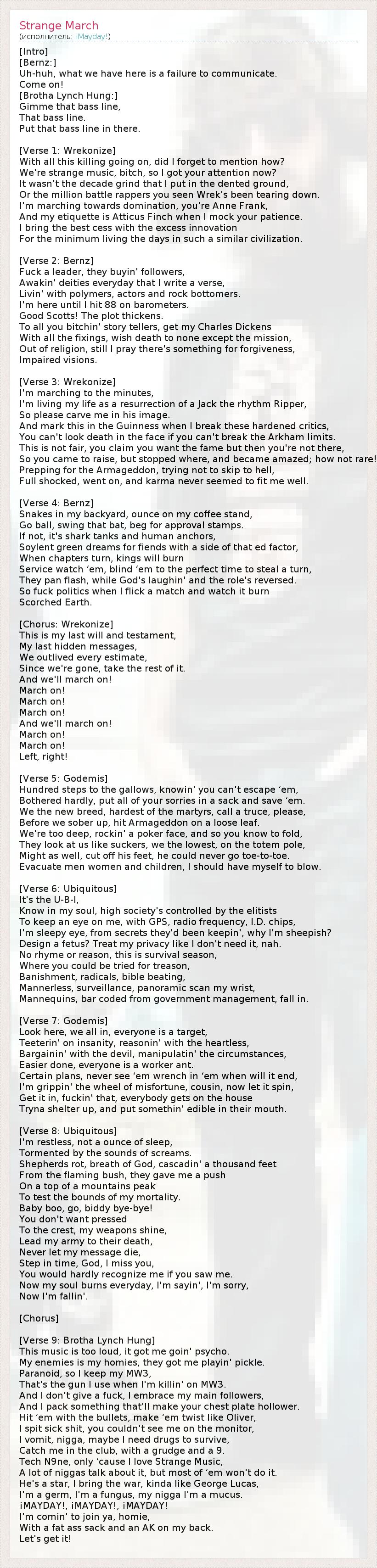 Это интересно:¡Mayday! - группа, выступающая в жанре альтернативный хип-хоп. Образовалась в Майами в 2004-2005 годах. Группа состоит из двух вокалистов: Bernie Garcia (aka Bernbiz) и Ben Miller (aka Wrekonize), клавишника: Aaron Eckhart (aka Plex Luthor), перкуссиониста: Andrews Mujica (aka NonMS),ударника Terrel (aka L T Hopkins) и басиста Gio (aka Gianni Cash).Группа известна благодаря андеграундному хиту "Quicksand", а также благодаря клипу на песню "Groundhog Day", в записи... продолжение