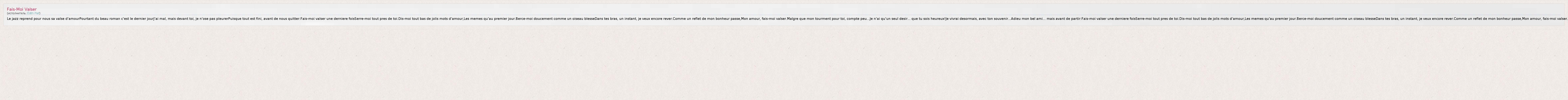 Le jazz reprend pour nous sa valse d'amourPourtant du beau roman c'est le dernier jourJ'ai mal, mais devant toi, je n'ose pas pleurerPuisque tout est fini, avant de nous quitter:Fais-moi valser une derniere foisSerre-moi tout pres de toi.Dis-moi tout bas de jolis mots d'amour,Les memes qu'au premier jour.Berce-moi doucement comme un oiseau blesseDans tes bras, un instant, je veux encore rever.Comme un reflet de mon bonheur passe,Mon amour, fais-moi valser.Malgre que mon tourment pour toi, compte peu...Je n'ai qu'un seul desir... que tu sois heureux!Je vivrai desormais, avec ton souvenir...Adieu mon bel ami... mais avant de partir:Fais-moi valser une derniere foisSerre-moi tout pres de toi.Dis-moi tout bas de jolis mots d'amour,Les memes qu'au premier jour.Berce-moi doucement comme un oiseau blesseDans tes bras, un instant, je veux encore rever.Comme un reflet de mon bonheur passe,Mon amour, fais-moi valser.