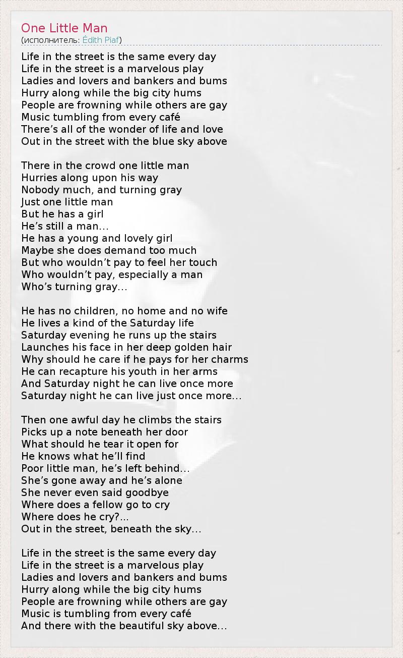 Это интересно:Эдит Пиаф - (фр. Édith Piaf, урожденная Эдит Джованна Гассион (фр. Édith Giovanna Gassion) 19 декабря 1915, Париж — 10 октября 1963, Грасс) — французская певица и актриса.Распространённая легенда гласит, что Эдит Пиаф родилась под уличным фонарём в Бельвиле, но это вряд ли соответствует действительности. Матерью Эдит была неудачливая актриса Анита Майяр, выступавшая под псевдонимом Лина Марса.... продолжение