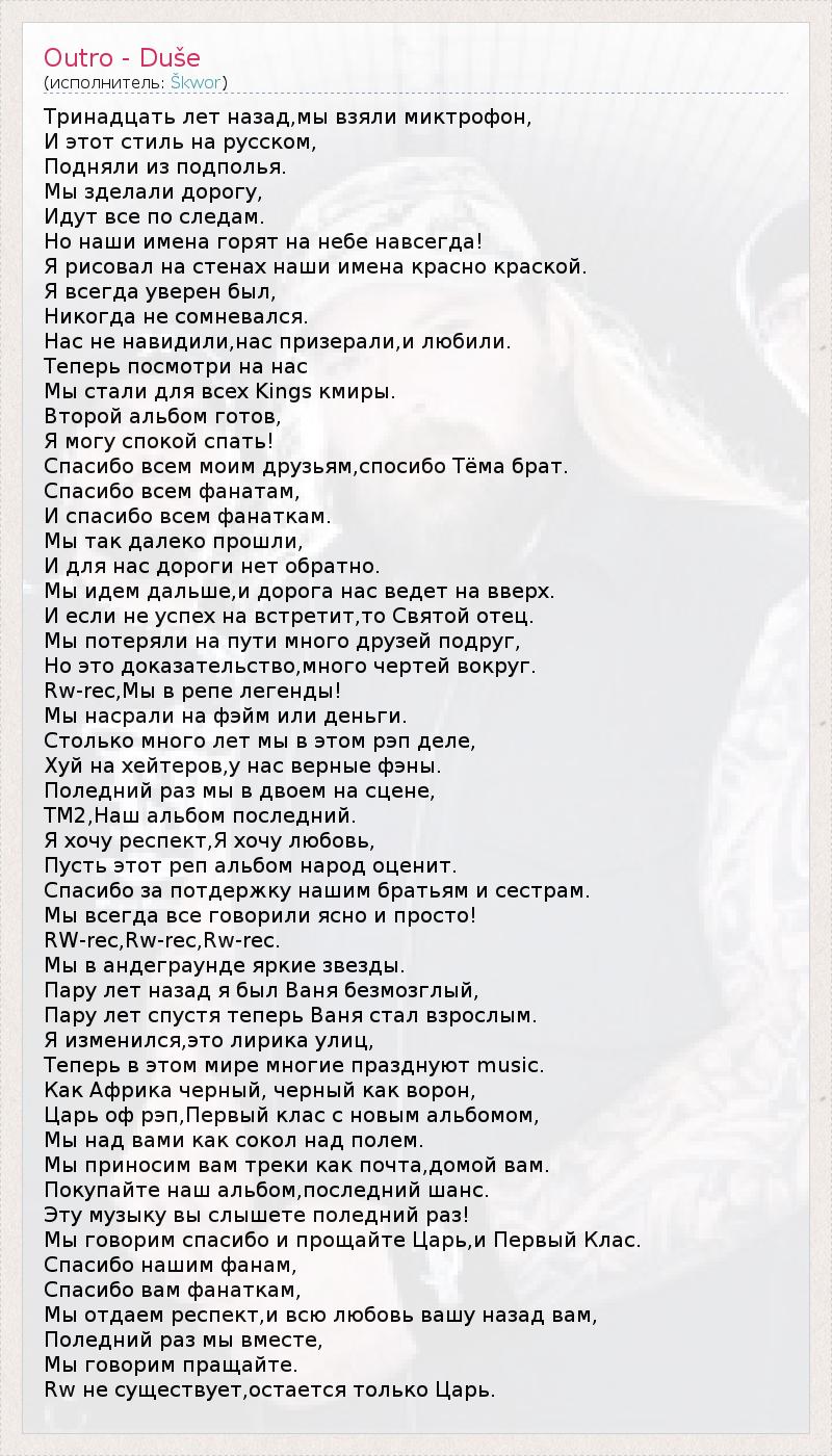 Тринадцать лет назад,мы взяли миктрофон, И этот стиль на русском, Подняли из подполья. Мы зделали дорогу, Идут все по следам. Но наши имена горят на небе навсегда! Я рисовал на стенах наши имена красно краской. Я всегда уверен был, Никогда не сомневался. Нас не навидили,нас призерали,и любили. Теперь посмотри на нас Мы стали для всех Kings кмиры. Второй альбом готов, Я могу спокой спать! Спасибо всем моим друзьям,спосибо Тёма брат. Спасибо всем фанатам, И спасибо всем фанаткам. Мы так далеко прошли, И для нас дороги нет обратно. Мы идем дальше,и дорога нас ведет на вверх. И если не успех на встретит,то Святой отец. Мы потеряли на пути много друзей подруг, Но это доказательство,много чертей вокруг. Rw-rec,Мы в репе легенды! Мы насрали на фэйм или деньги. Столько много лет мы в этом рэп деле, Хуй на хейтеров,у нас верные фэны. Поледний раз мы в двоем на сцене, ТМ2,Наш альбом последний. Я хочу респект,Я хочу любовь, Пусть этот реп альбом народ оценит. Спасибо за потдержку нашим братьям и сестрам. Мы всегда все говорили ясно и просто! RW-rec,Rw-rec,Rw-rec. Мы в андеграунде яркие звезды. Пару лет назад я был Ваня безмозглый, Пару лет спустя теперь Ваня стал взрослым. Я изменился,это лирика улиц, Теперь в этом мире многие празднуют music. Как Африка черный, черный как ворон, Царь оф рэп,Первый клас с новым альбомом, Мы над вами как сокол над полем. Мы приносим вам треки как почта,домой вам. Покупайте наш альбом,последний шанс. Эту музыку вы слышете поледний раз! Мы говорим спасибо и прощайте Царь,и Первый Клас. Спасибо нашим фанам, Спасибо вам фанаткам, Мы отдаем респект,и всю любовь вашу назад вам, Поледний раз мы вместе, Мы говорим пращайте. Rw не существует,остается только Царь.