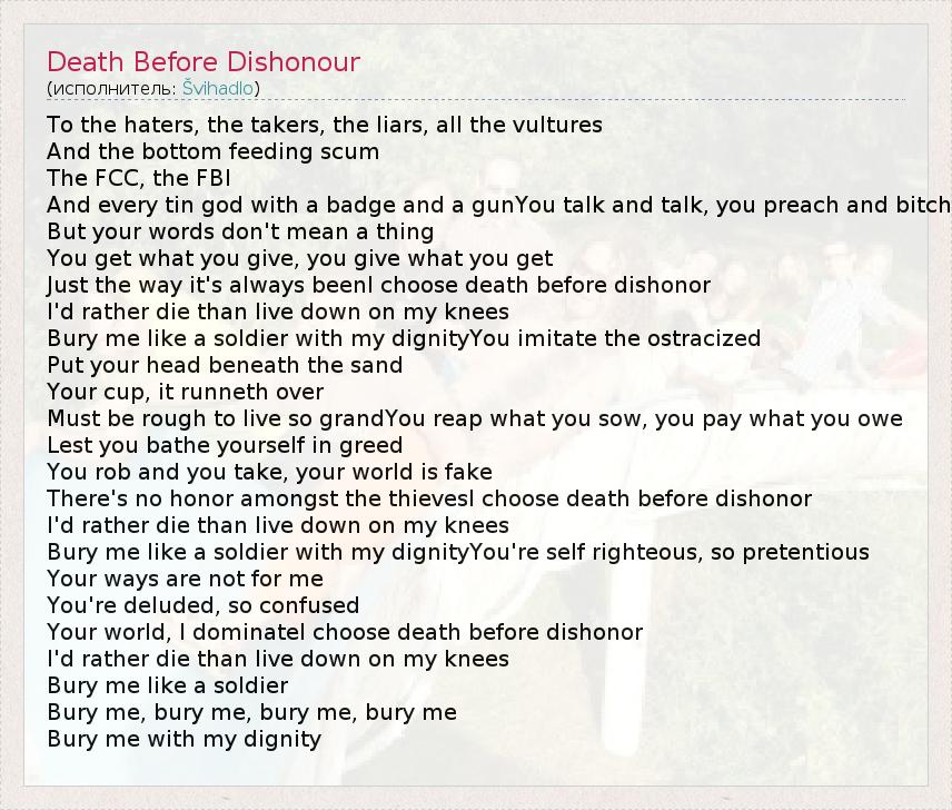 А как ты думаешь, о чем песня "Death Before Dishonour" ?