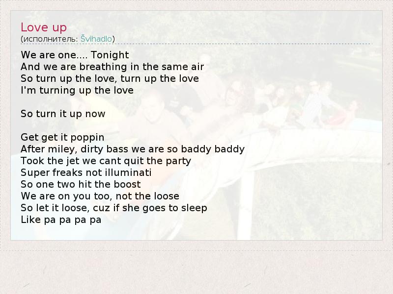 We are one.... Tonight And we are breathing in the same air So turn up the love, turn up the love I'm turning up the love So turn it up now Get get it poppin After miley, dirty bass we are so baddy baddy Took the jet we cant quit the party Super freaks not illuminati So one two hit the boost We are on you too, not the loose So let it loose, cuz if she goes to sleep Like pa pa pa pa