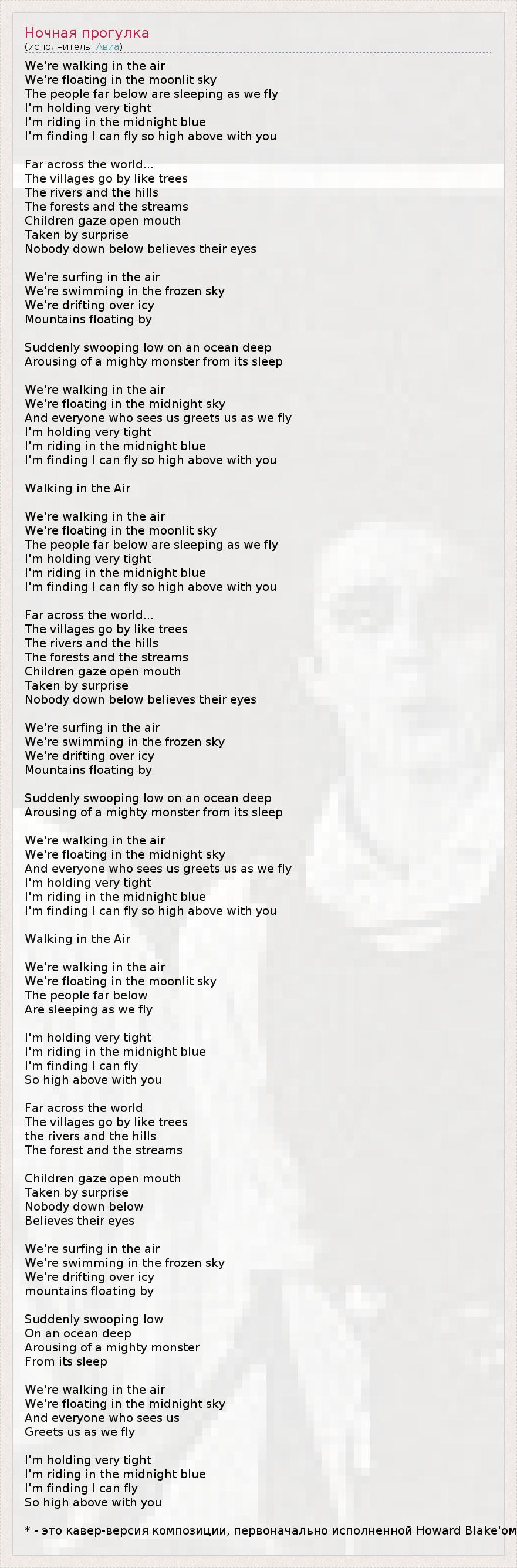 We're walking in the air We're floating in the moonlit sky The people far below are sleeping as we fly I'm holding very tight I'm riding in the midnight blue I'm finding I can fly so high above with you Far across the world... The villages go by like trees The rivers and the hills The forests and the streams Children gaze open mouth Taken by surprise Nobody down below believes their eyes We're surfing in the air We're swimming in the frozen sky We're drifting over icy Mountains floating by Suddenly swooping low on an ocean deep Arousing of a mighty monster from its sleep We're walking in the air We're floating in the midnight sky And everyone who sees us greets us as we fly I'm holding very tight I'm riding in the midnight blue I'm finding I can fly so high above with you Walking in the Air We're walking in the air We're floating in the moonlit sky The people far below are sleeping as we fly I'm holding very tight I'm riding in the midnight blue I'm finding I can fly so high above with you Far across the world... The villages go by like trees The rivers and the hills The forests and the streams Children gaze open mouth Taken by surprise Nobody down below believes their eyes We're surfing in the air We're swimming in the frozen sky We're drifting over icy Mountains floating by Suddenly swooping low on an ocean deep Arousing of a mighty monster from its sleep We're walking in the air We're floating in the midnight sky And everyone who sees us greets us as we fly I'm holding very tight I'm riding in the midnight blue I'm finding I can fly so high above with you Walking in the Air We're walking in the air We're floating in the moonlit sky The people far below Are sleeping as we fly I'm holding very tight I'm riding in the midnight blue I'm finding I can fly So high above with you Far across the world The villages go by like trees the rivers and the hills The forest and the streams Children gaze open mouth Taken by surprise Nobody down below Believes their eyes We're surfing in the air We're swimming in the frozen sky We're drifting over icy mountains floating by Suddenly swooping low On an ocean deep Arousing of a mighty monster From its sleep We're walking in the air We're floating in the midnight sky And everyone who sees us Greets us as we fly I'm holding very tight I'm riding in the midnight blue I'm finding I can fly So high above with you * - это кавер-версия композиции, первоначально исполненной Howard Blake'ом