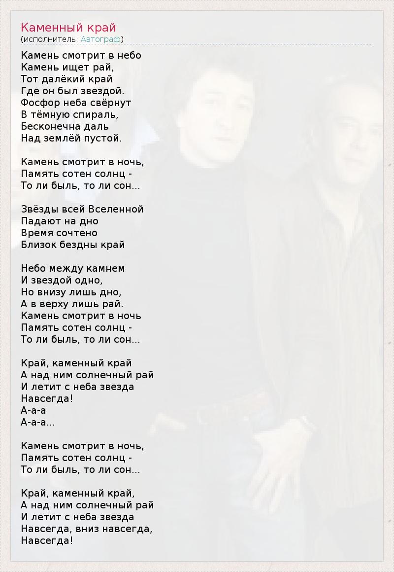 Камень смотрит в небо Камень ищет рай, Тот далёкий край Где он был звездой. Фосфор неба свёрнут В тёмную спираль, Бесконечна даль Над землёй пустой. Камень смотрит в ночь, Память сотен солнц - То ли быль, то ли сон... Звёзды всей Вселенной Падают на дно Время сочтено Близок бездны край Небо между камнем И звездой одно, Но внизу лишь дно, А в верху лишь рай. Камень смотрит в ночь Память сотен солнц - То ли быль, то ли сон... Край, каменный край А над ним солнечный рай И летит с неба звезда Навсегда! А-а-а А-а-а... Камень смотрит в ночь, Память сотен солнц - То ли быль, то ли сон... Край, каменный край, А над ним солнечный рай И летит с неба звезда Навсегда, вниз навсегда, Навсегда!