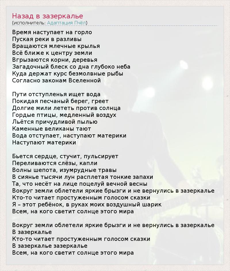 Время наступает на горло Пуская реки в разливы Вращаются млечные крылья Всё ближе к центру земли Вгрызаются корни, деревья Загадочный блеск со дна глубоко неба Куда держат курс безмолвные рыбы Согласно законам Вселенной Пути отступленья ищет вода Покидая песчаный берег, греет Долгие мили лететь против солнца Гордые птицы, медленный воздух Льётся причудливой пылью Каменные великаны тают Вода отступает, наступают материки Наступают материки Бьется сердце, стучит, пульсирует Переливаются cлёзы, капли Волны шепота, изумрудные травы В сиянье тысячи лун расплетая тонкие запахи Та, что несёт на лице поцелуй вечной весны Вокруг земли облетели яркие брызги и не вернулись в зазеркалье Кто-то читает простуженным голосом сказки Я – этот ребёнок, в руках моих воздушный шарик Всем, на кого светит солнце этого мира Вокруг земли облетели яркие брызги и не вернулись в зазеркалье В зазеркалье Кто-то читает простуженным голосом сказки В зазеркалье зазеркалье Всем, на кого светит солнце этого мира