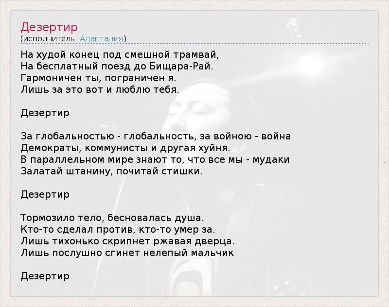 На худой конец под смешной трамвай, На бесплатный поезд до Бищара-Рай. Гармоничен ты, пограничен я. Лишь за это вот и люблю тебя. Дезертир За глобальностью - глобальность, за войною - война Демократы, коммунисты и другая хуйня. В параллельном мире знают то, что все мы - мудаки Залатай штанину, почитай стишки. Дезертир Тормозило тело, бесновалась душа. Кто-то сделал против, кто-то умер за. Лишь тихонько скрипнет ржавая дверца. Лишь послушно сгинет нелепый мальчик Дезертир