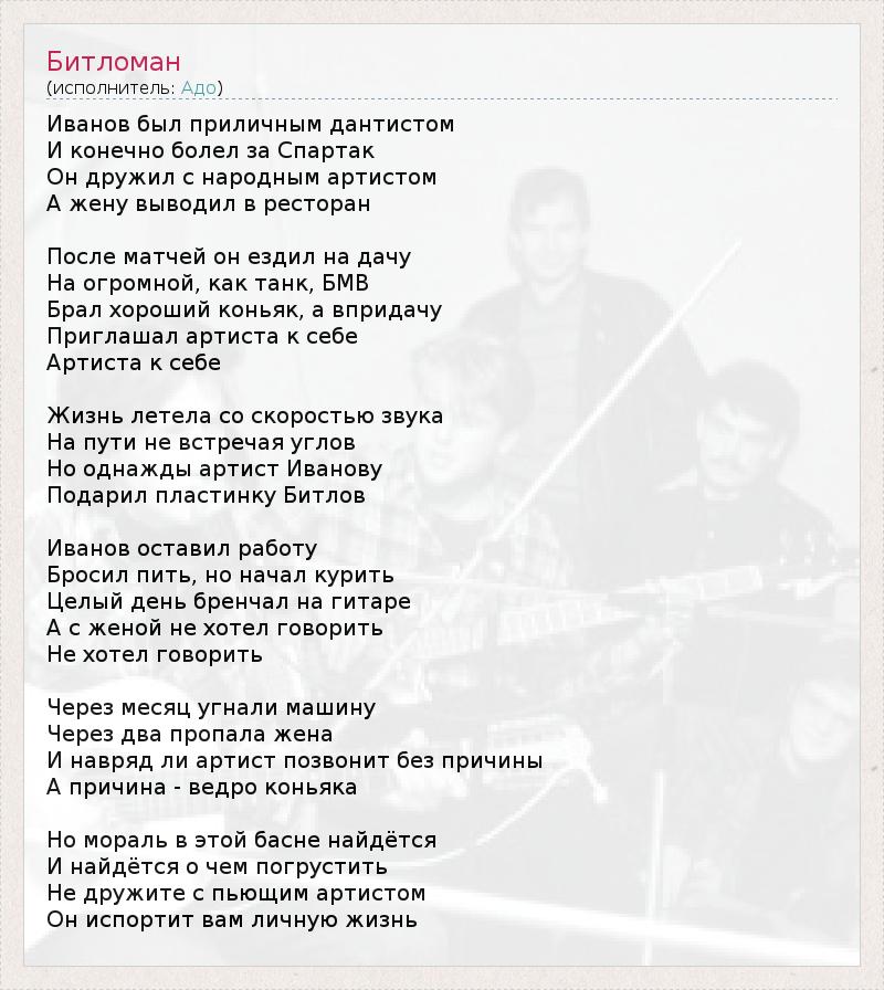 Это интересно:«Адо́» — российская рок-группа, образовавшаяся в 1988 году в подмосковном городе Коломна (немного позже группа практически стала московской). Бессменный лидер и автор песен — Андрей Горохов, выпускник МВТУ им. Баумана.«Адо́» исполняет мелодичный рок, с яркими образными текстами. В записи некоторых песен участвовали Константин Никольский, Олег Сакмаров и другие приглашённые... продолжение