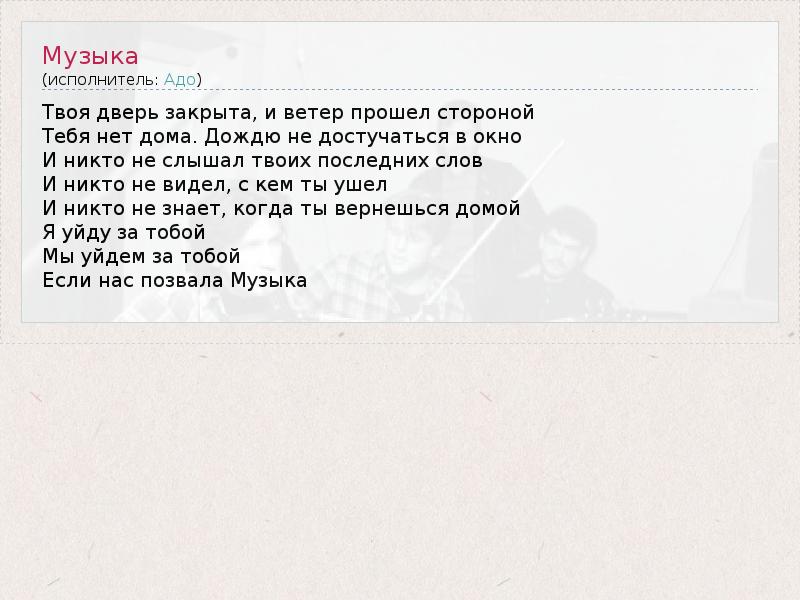 Твоя дверь закрыта, и ветер прошел стороной Тебя нет дома. Дождю не достучаться в окно И никто не слышал твоих последних слов И никто не видел, с кем ты ушел И никто не знает, когда ты вернешься домой Я уйду за тобой Мы уйдем за тобой Если нас позвала Музыка