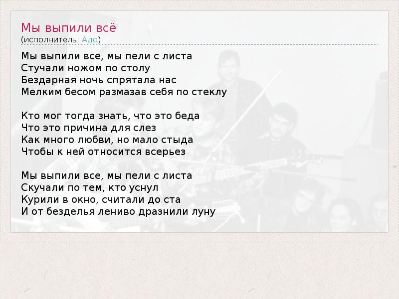 А как ты думаешь, о чем песня "Мы выпили всё" ?