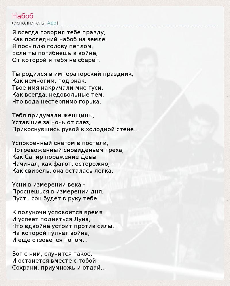 Это интересно:«Адо́» — российская рок-группа, образовавшаяся в 1988 году в подмосковном городе Коломна (немного позже группа практически стала московской). Бессменный лидер и автор песен — Андрей Горохов, выпускник МВТУ им. Баумана.«Адо́» исполняет мелодичный рок, с яркими образными текстами. В записи некоторых песен участвовали Константин Никольский, Олег Сакмаров и другие приглашённые... продолжение