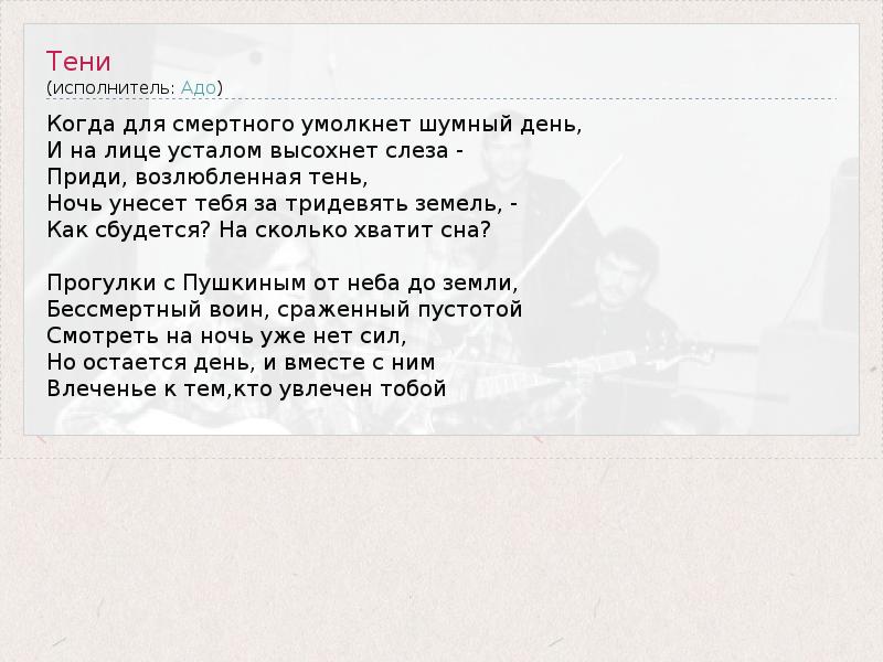 Это интересно:«Адо́» — российская рок-группа, образовавшаяся в 1988 году в подмосковном городе Коломна (немного позже группа практически стала московской). Бессменный лидер и автор песен — Андрей Горохов, выпускник МВТУ им. Баумана.«Адо́» исполняет мелодичный рок, с яркими образными текстами. В записи некоторых песен участвовали Константин Никольский, Олег Сакмаров и другие приглашённые... продолжение