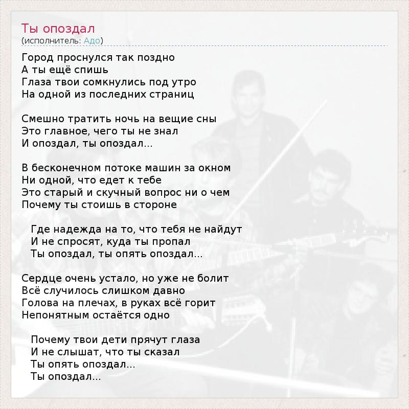 Город проснулся так поздно А ты ещё спишь Глаза твои сомкнулись под утро На одной из последних страниц Смешно тратить ночь на вещие сны Это главное, чего ты не знал И опоздал, ты опоздал... В бесконечном потоке машин за окном Ни одной, что едет к тебе Это старый и скучный вопрос ни о чем Почему ты стоишь в стороне Где надежда на то, что тебя не найдут И не спросят, куда ты пропал Ты опоздал, ты опять опоздал... Сердце очень устало, но уже не болит Всё случилось слишком давно Голова на плечах, в руках всё горит Непонятным остаётся одно Почему твои дети прячут глаза И не слышат, что ты сказал Ты опять опоздал... Ты опоздал...