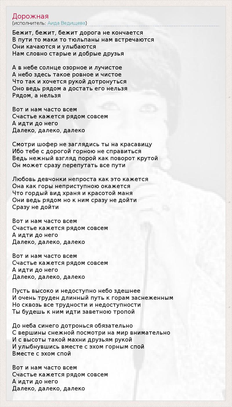 Это интересно:Аида Семёновна Ведищева (урождённая Аида Соломоновна Вайс, р. 10 июля 1941, Казань) — советская певица, более всего известная как исполнительница популярных песен из кинофильмов («Песенка о медведях», «Помоги мне», «Лесной олень») и мультфильмов («Колыбельная Медведицы», «Чунга-Чанга»).На сцене стала выступать с начала 60-х годов как эстрадная певица Харьковской филармонии. Пела в оркестре... продолжение
