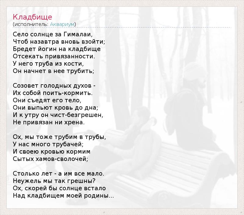 Село солнце за Гималаи, Чтоб назавтра вновь взойти; Бредет йогин на кладбище Отсекать привязанности. У него труба из кости, Он начнет в нее трубить; Созовет голодных духов - Их собой поить-кормить. Они съедят его тело, Они выпьют кровь до дна; И к утру он чист-безгрешен, Не привязан ни хрена. Ох, мы тоже трубим в трубы, У нас много трубачей; И своею кровью кормим Сытых хамов-сволочей; Столько лет - а им все мало. Неужель мы так грешны? Ох, скорей бы солнце встало Над кладбищем моей родины...