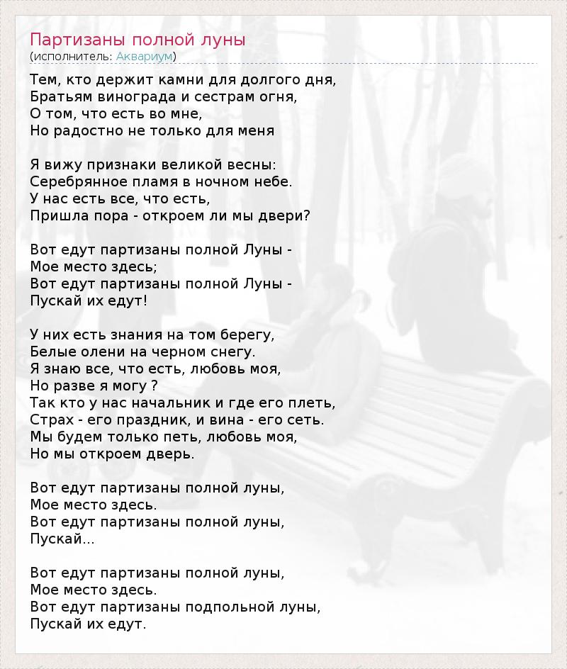 Текст песни Партизаны полной луны группа АквариумТем, кто держит камни для долгого дня,