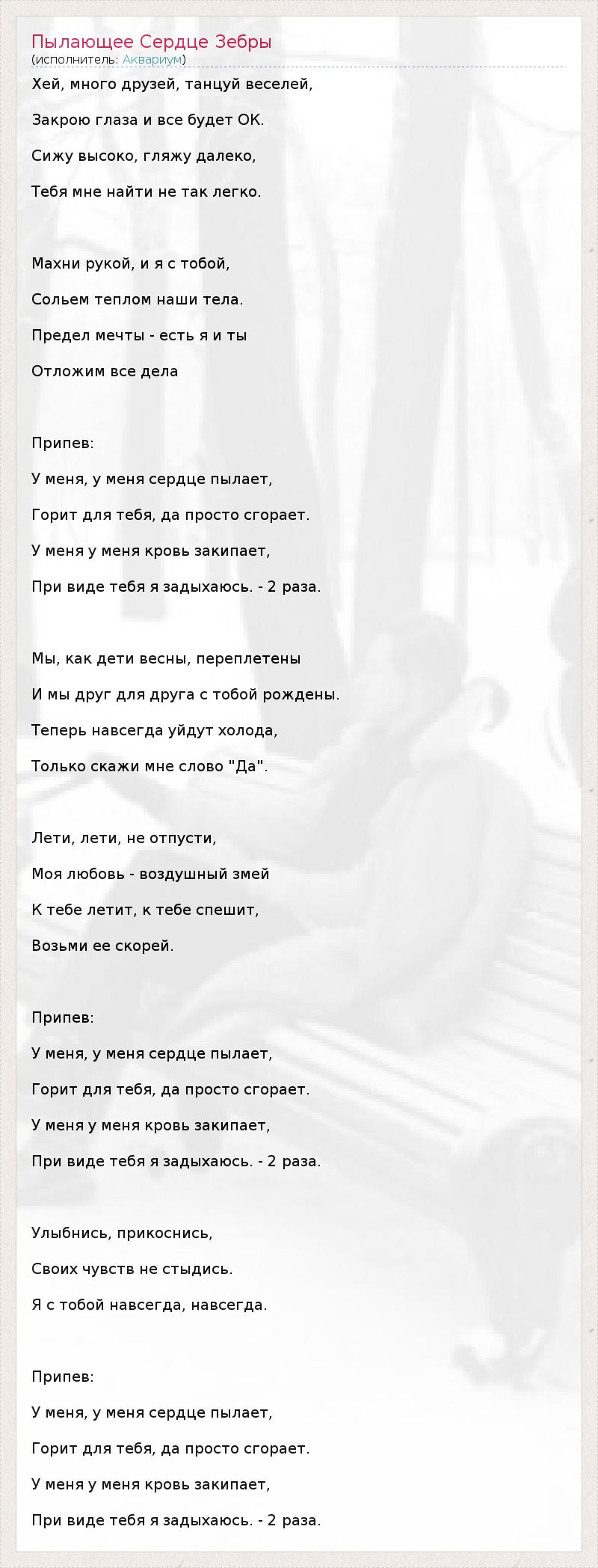 ГлавнаяИсполнителиАквариумПылающее Сердце Зебры