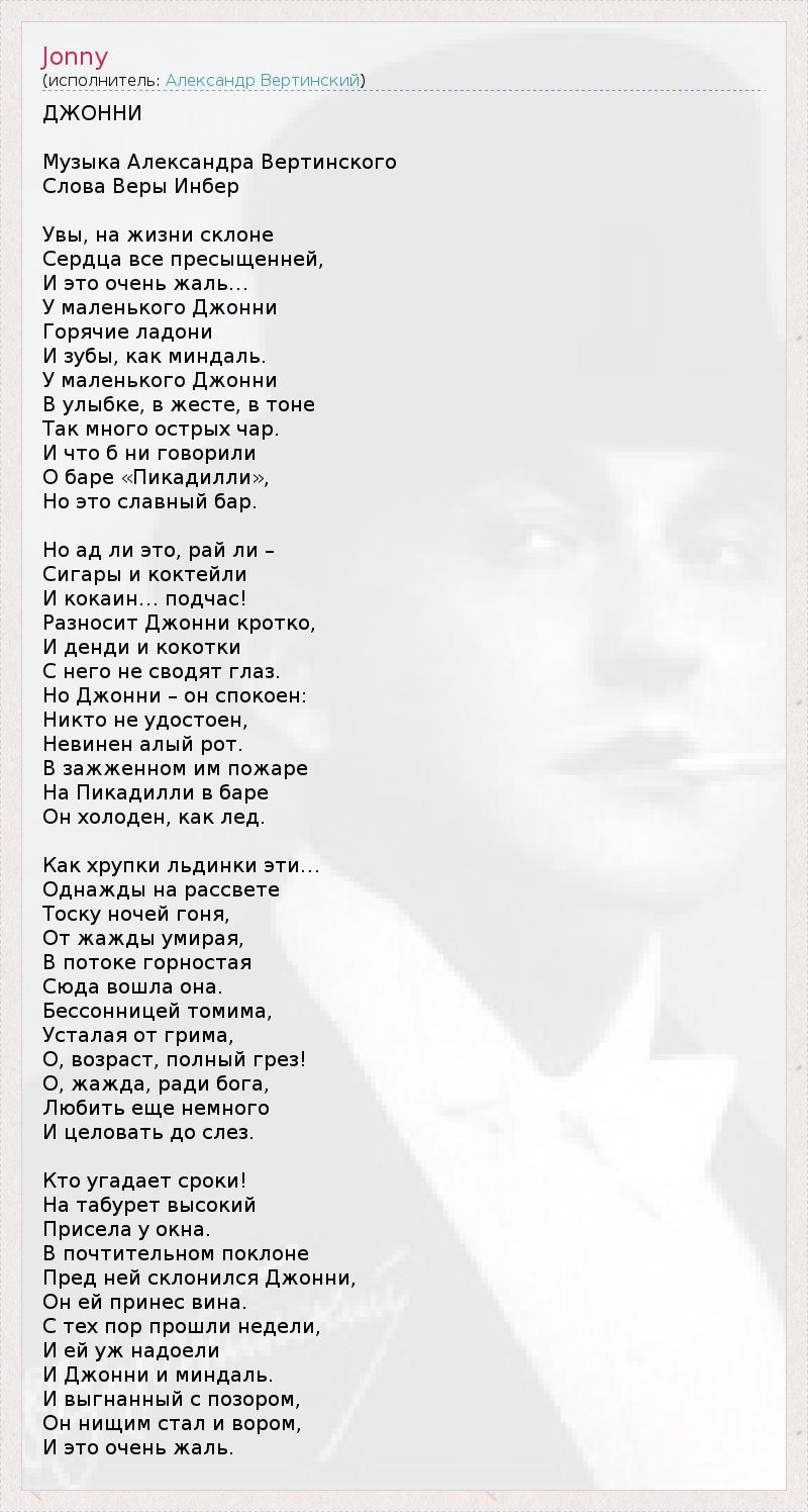 Это интересно:Александр Вертинский родился в Киеве 9 (21) марта 1889 года. Здесь же прошло его детство.Его отец, адвокат, не был официально женат на его матери, так как ему не давала развода первая жена. После смерти матери отцу пришлось "усыновить" детей. Сестра Надя осталась жить у отца, а Александра отдали тетке, Марье Степановне, сестре матери. Отец очень тяжело переживал смерть жены. Вскоре он... продолжение