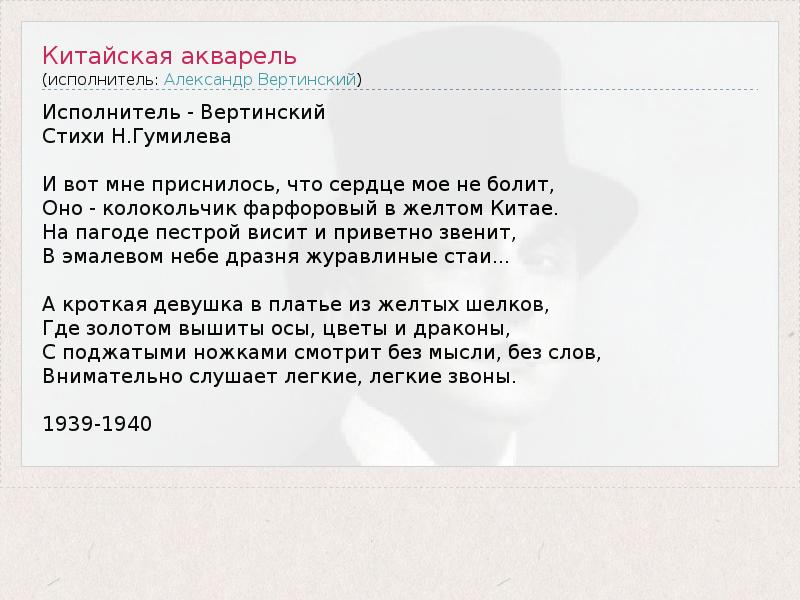 Исполнитель - Вертинский Стихи Н.Гумилева И вот мне приснилось, что сердце мое не болит, Оно - колокольчик фарфоровый в желтом Китае. На пагоде пестрой висит и приветно звенит, В эмалевом небе дразня журавлиные стаи... А кроткая девушка в платье из желтых шелков, Где золотом вышиты осы, цветы и драконы, С поджатыми ножками смотрит без мысли, без слов, Внимательно слушает легкие, легкие звоны. 1939-1940
