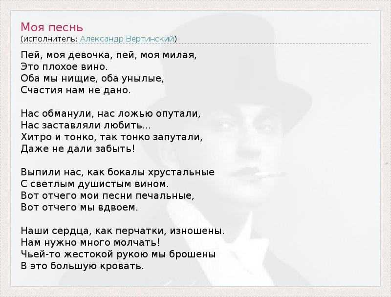 Пей, моя девочка, пей, моя милая, Это плохое вино. Оба мы нищие, оба унылые, Счастия нам не дано. Нас обманули, нас ложью опутали, Нас заставляли любить... Хитро и тонко, так тонко запутали, Даже не дали забыть! Выпили нас, как бокалы хрустальные С светлым душистым вином. Вот отчего мои песни печальные, Вот отчего мы вдвоем. Наши сердца, как перчатки, изношены. Нам нужно много молчать! Чьей-то жестокой рукою мы брошены В это большую кровать.