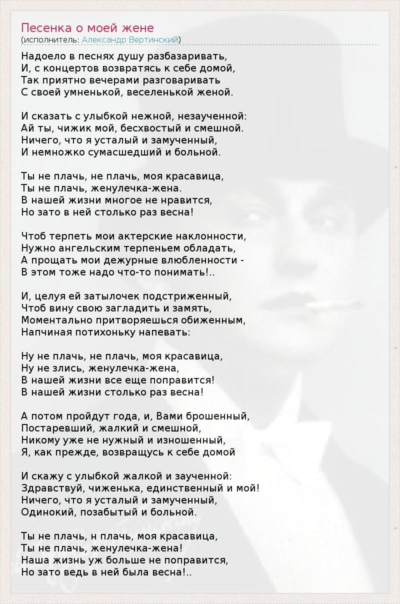 Надоело в песнях душу разбазаривать, И, с концертов возвратясь к себе домой, Так приятно вечерами разговаривать С своей умненькой, веселенькой женой. И сказать с улыбкой нежной, незаученной: Ай ты, чижик мой, бесхвостый и смешной. Ничего, что я усталый и замученный, И немножко сумасшедший и больной. Ты не плачь, не плачь, моя красавица, Ты не плачь, женулечка-жена. В нашей жизни многое не нравится, Но зато в ней столько раз весна! Чтоб терпеть мои актерские наклонности, Нужно ангельским терпеньем обладать, А прощать мои дежурные влюбленности - В этом тоже надо что-то понимать!.. И, целуя ей затылочек подстриженный, Чтоб вину свою загладить и замять, Моментально притворяешься обиженным, Напчиная потихоньку напевать: Ну не плачь, не плачь, моя красавица, Ну не злись, женулечка-жена, В нашей жизни все еще поправится! В нашей жизни столько раз весна! А потом пройдут года, и, Вами брошенный, Постаревший, жалкий и смешной, Никому уже не нужный и изношенный, Я, как прежде, возвращусь к себе домой И скажу с улыбкой жалкой и заученной: Здравствуй, чиженька, единственный и мой! Ничего, что я усталый и замученный, Одинокий, позабытый и больной. Ты не плачь, н плачь, моя красавица, Ты не плачь, женулечка-жена! Наша жизнь уж больше не поправится, Но зато ведь в ней была весна!..