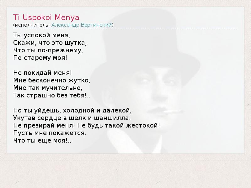 Ты успокой меня, Скажи, что это шутка, Что ты по-прежнему, По-старому моя! Не покидай меня! Мне бесконечно жутко, Мне так мучительно, Так страшно без тебя!.. Но ты уйдешь, холодной и далекой, Укутав сердце в шелк и шаншилла. Не презирай меня! Не будь такой жестокой! Пусть мне покажется, Что ты еще моя!..