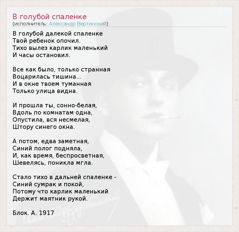 Это интересно:Александр Вертинский родился в Киеве 9 (21) марта 1889 года. Здесь же прошло его детство.Его отец, адвокат, не был официально женат на его матери, так как ему не давала развода первая жена. После смерти матери отцу пришлось "усыновить" детей. Сестра Надя осталась жить у отца, а Александра отдали тетке, Марье Степановне, сестре матери. Отец очень тяжело переживал смерть жены. Вскоре он... продолжение