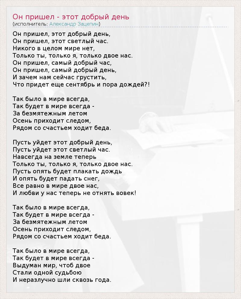 ГлавнаяИсполнителиАлександр ЗацепинОн пришел - этот добрый день