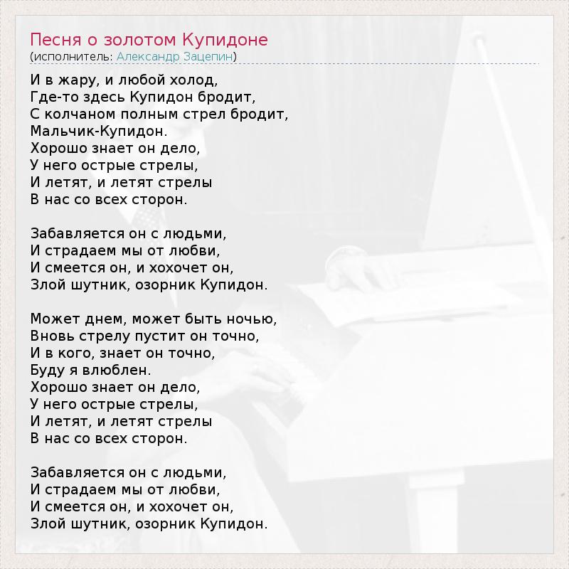 ГлавнаяИсполнителиАлександр ЗацепинПесня о золотом Купидоне