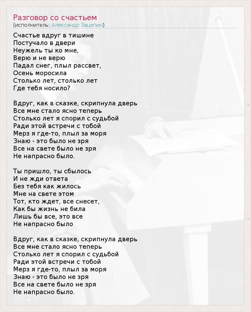 Счастье вдруг в тишине Постучало в двери Неужель ты ко мне, Верю и не верю Падал снег, плыл рассвет, Осень моросила Столько лет, столько лет Где тебя носило? Вдруг, как в сказке, скрипнула дверь Все мне стало ясно теперь Столько лет я спорил с судьбой Ради этой встречи с тобой Мерз я где-то, плыл за моря Знаю - это было не зря Все на свете было не зря Не напрасно было. Ты пришло, ты сбылось И не жди ответа Без тебя как жилось Мне на свете этом Тот, кто ждет, все снесет, Как бы жизнь не била Лишь бы все, это все Не напрасно было Вдруг, как в сказке, скрипнула дверь Все мне стало ясно теперь Столько лет я спорил с судьбой Ради этой встречи с тобой Мерз я где-то, плыл за моря Знаю - это было не зря Все на свете было не зря Не напрасно было.