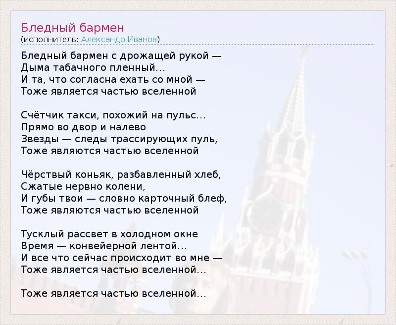 А как ты думаешь, о чем песня "Бледный бармен" ?