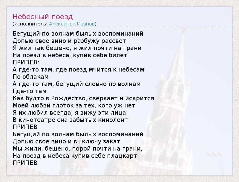 Бегущий по волнам былых воспоминаний Допью свое вино и разбужу рассвет Я жил так бешено, я жил почти на грани На поезд в небеса, купив себе билет ПРИПЕВ: А где-то там, где поезд мчится к небесам По облакам А где-то там, бегущий словно по волнам Где-то там Как будто в Рождество, сверкает и искрится Моей любви глоток за тех, кого уж нет Я их любил всегда, я вижу эти лица В кинотеатре сна забытых кинолент ПРИПЕВ Бегущий по волнам былых воспоминаний Допью свое вино и выключу закат Мы жили, бешено, порой почти на грани, На поезд в небеса купив себе плацкарт ПРИПЕВ