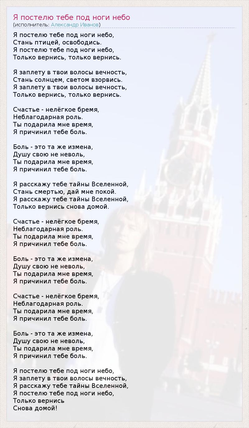 ГлавнаяИсполнителиАлександр ИвановЯ постелю тебе под ноги небо
