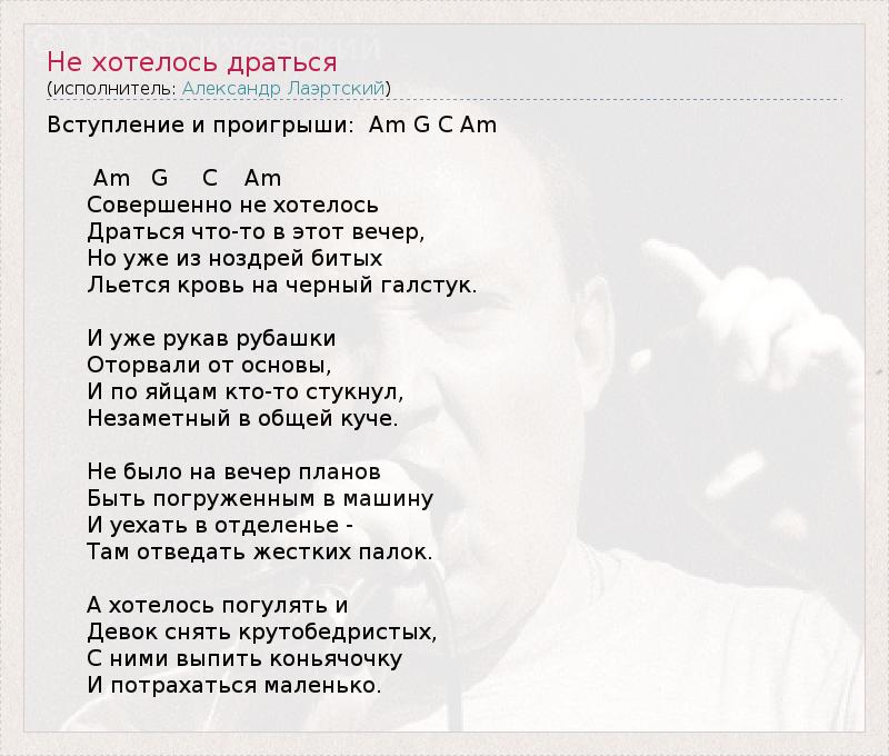 Это интересно:"Если скрупулезно изучать каждую свою строчку, я вообще не смогу писать. У меня песни - это как поток сознания, и не надо ему мешать" ("Я молодой", апрель 1994).Песни Александра Лаэртского (Уварова) стали известны гораздо раньше, чем он сам. С конца 80-х гг. на аудиокассетах стали распространяться весьма скверно записанные альбомы с песнями в стиле черного юмора. Автором жизнеутверждающих... продолжение