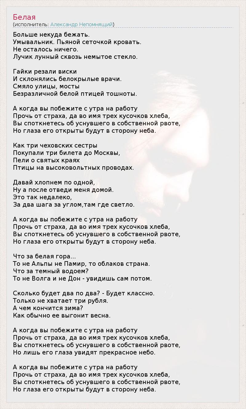 Это интересно:Александр Евгеньевич Непомнящий (род. 16 февраля 1968 года в Коврове, ум. 20 апреля 2007 года в Иваново) — русский поэт, бард, рок-музыкант.В начале 90-х стал лауреатом фестиваля «Оскольская Лира», и с тех пор был неизменным членом жюри (лауреатом фестиваля был Веня Д’ркин и множество других интересных авторов).На протяжении 90-х и начала 2000-х годов считался одной из знаковых фигур в отечественной... продолжение