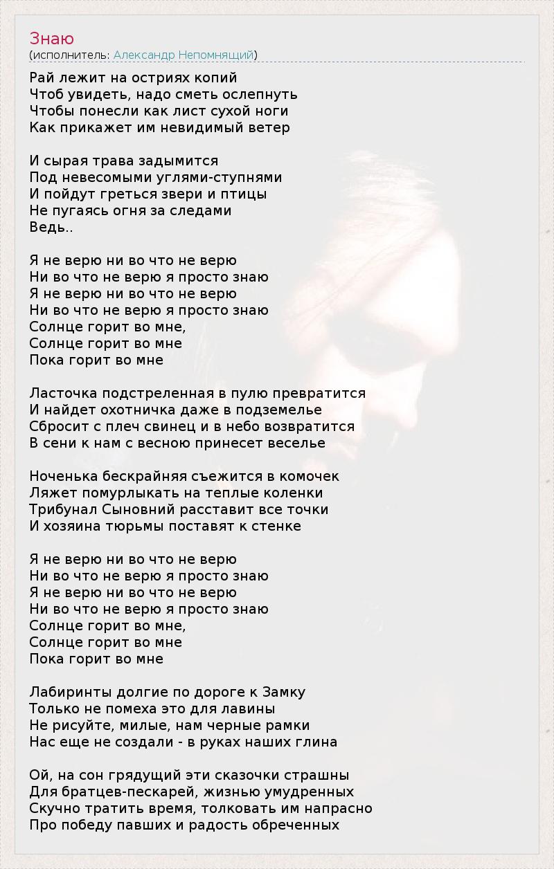 Это интересно:Александр Евгеньевич Непомнящий (род. 16 февраля 1968 года в Коврове, ум. 20 апреля 2007 года в Иваново) — русский поэт, бард, рок-музыкант.В начале 90-х стал лауреатом фестиваля «Оскольская Лира», и с тех пор был неизменным членом жюри (лауреатом фестиваля был Веня Д’ркин и множество других интересных авторов).На протяжении 90-х и начала 2000-х годов считался одной из знаковых фигур в отечественной... продолжение