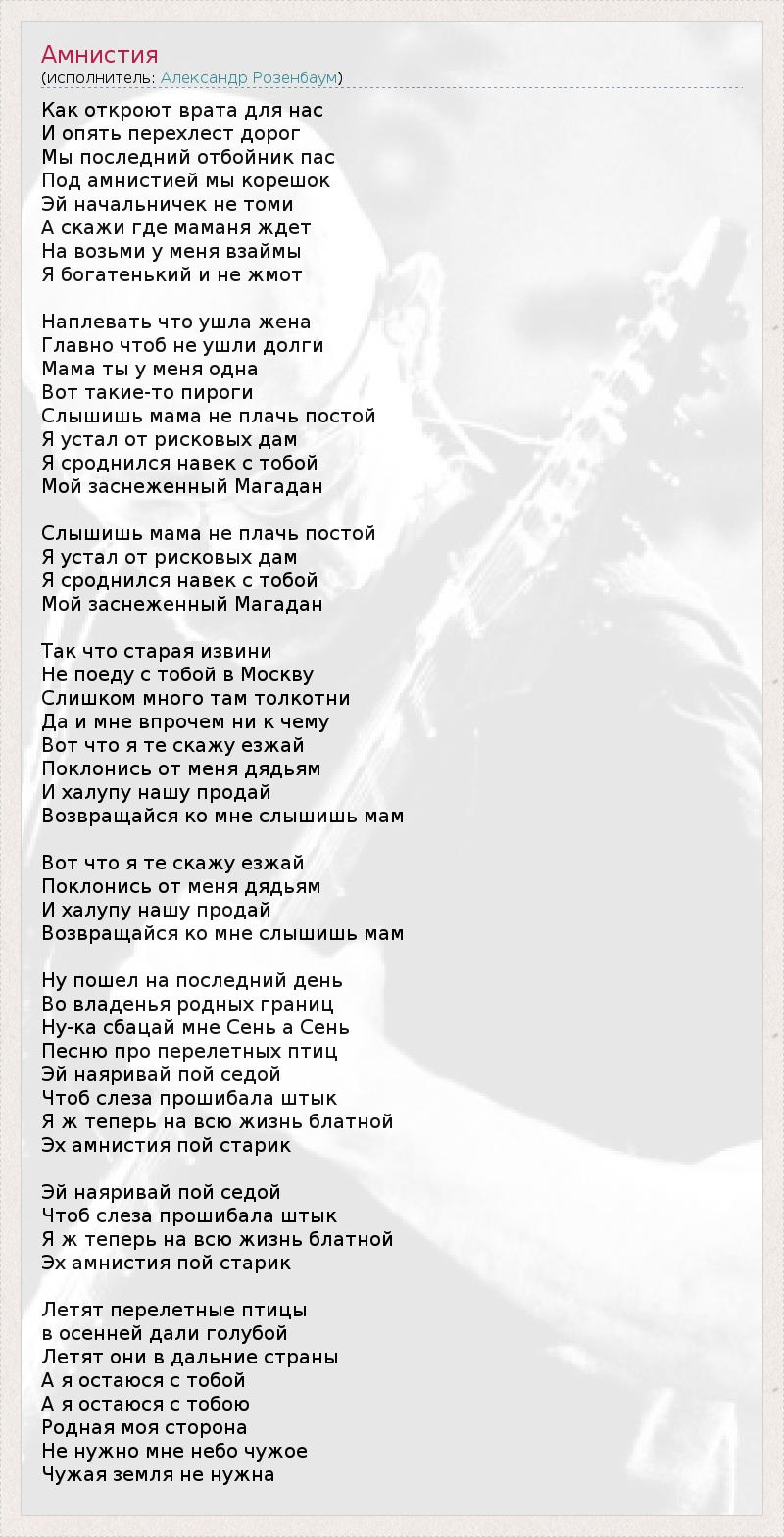 Это интересно:Александр Яковлевич Розенбаум (род. 13 сентября 1951, Ленинград) — исполнитель авторской песни.В 1968—1974 учился в Первом медицинском институте в Ленинграде. Работал врачом скорой помощи. Занимался в вечернем джазовом училище при Дворце культуры имени Кирова. Началом сольной деятельности можно считать памятное выступление 14 октября 1983 года в Доме культуры МВД имени Дзержинского.Розенбаум... продолжение