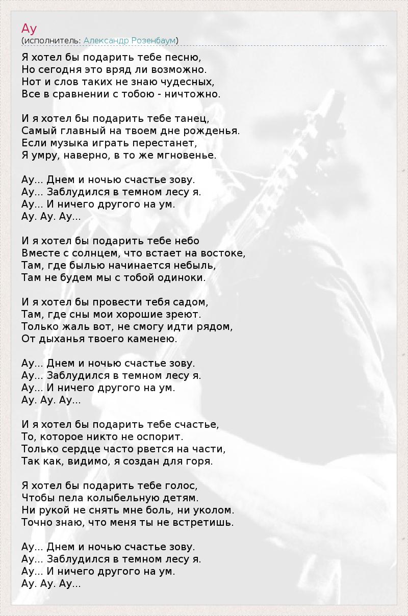 Это интересно:Александр Яковлевич Розенбаум (род. 13 сентября 1951, Ленинград) — исполнитель авторской песни.В 1968—1974 учился в Первом медицинском институте в Ленинграде. Работал врачом скорой помощи. Занимался в вечернем джазовом училище при Дворце культуры имени Кирова. Началом сольной деятельности можно считать памятное выступление 14 октября 1983 года в Доме культуры МВД имени Дзержинского.Розенбаум... продолжение