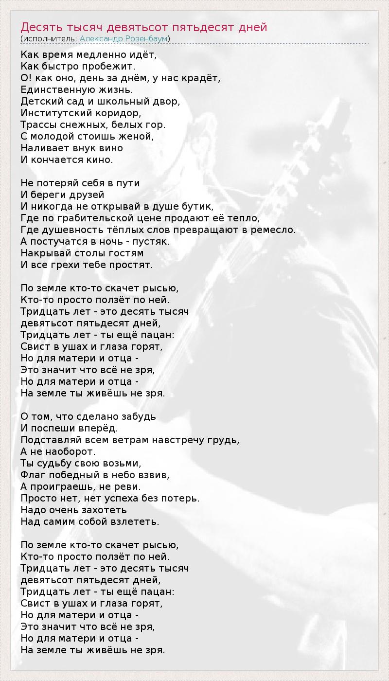 Как время медленно идёт, Как быстро пробежит. О! как оно, день за днём, у нас крадёт, Единственную жизнь. Детский сад и школьный двор, Институтский коридор, Трассы снежных, белых гор. С молодой стоишь женой, Наливает внук вино И кончается кино. Не потеряй себя в пути И береги друзей И никогда не открывай в душе бутик, Где по грабительской цене продают её тепло, Где душевность тёплых слов превращают в ремесло. А постучатся в ночь - пустяк. Накрывай столы гостям И все грехи тебе простят. По земле кто-то скачет рысью, Кто-то просто ползёт по ней. Тридцать лет - это десять тысяч девятьсот пятьдесят дней, Тридцать лет - ты ещё пацан: Свист в ушах и глаза горят, Но для матери и отца - Это значит что всё не зря, Но для матери и отца - На земле ты живёшь не зря. О том, что сделано забудь И поспеши вперёд. Подставляй всем ветрам навстречу грудь, А не наоборот. Ты судьбу свою возьми, Флаг победный в небо взвив, А проиграешь, не реви. Просто нет, нет успеха без потерь. Надо очень захотеть Над самим собой взлететь. По земле кто-то скачет рысью, Кто-то просто ползёт по ней. Тридцать лет - это десять тысяч девятьсот пятьдесят дней, Тридцать лет - ты ещё пацан: Свист в ушах и глаза горят, Но для матери и отца - Это значит что всё не зря, Но для матери и отца - На земле ты живёшь не зря.