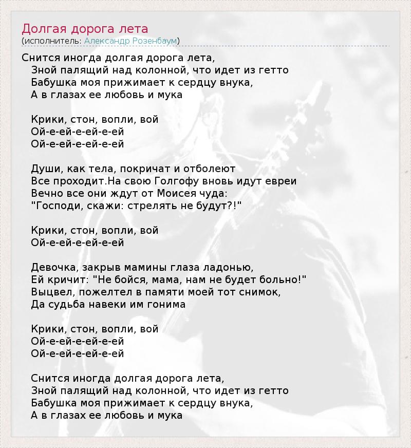 Это интересно:Александр Яковлевич Розенбаум (род. 13 сентября 1951, Ленинград) — исполнитель авторской песни.В 1968—1974 учился в Первом медицинском институте в Ленинграде. Работал врачом скорой помощи. Занимался в вечернем джазовом училище при Дворце культуры имени Кирова. Началом сольной деятельности можно считать памятное выступление 14 октября 1983 года в Доме культуры МВД имени Дзержинского.Розенбаум... продолжение
