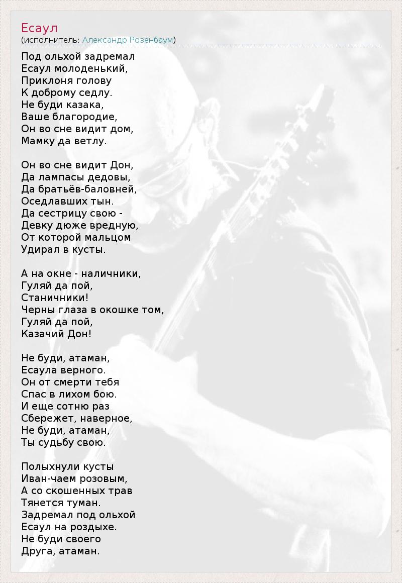 Это интересно:Александр Яковлевич Розенбаум (род. 13 сентября 1951, Ленинград) — исполнитель авторской песни.В 1968—1974 учился в Первом медицинском институте в Ленинграде. Работал врачом скорой помощи. Занимался в вечернем джазовом училище при Дворце культуры имени Кирова. Началом сольной деятельности можно считать памятное выступление 14 октября 1983 года в Доме культуры МВД имени Дзержинского.Розенбаум... продолжение