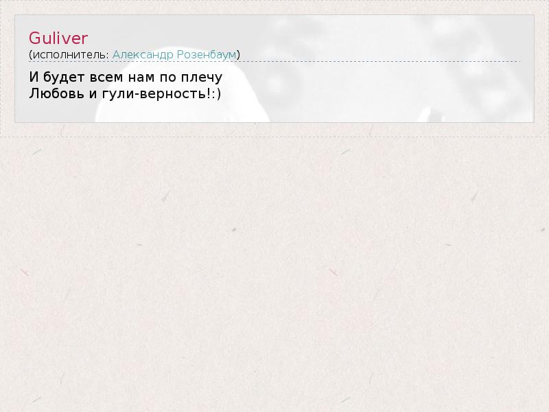 Это интересно:Александр Яковлевич Розенбаум (род. 13 сентября 1951, Ленинград) — исполнитель авторской песни.В 1968—1974 учился в Первом медицинском институте в Ленинграде. Работал врачом скорой помощи. Занимался в вечернем джазовом училище при Дворце культуры имени Кирова. Началом сольной деятельности можно считать памятное выступление 14 октября 1983 года в Доме культуры МВД имени Дзержинского.Розенбаум... продолжение